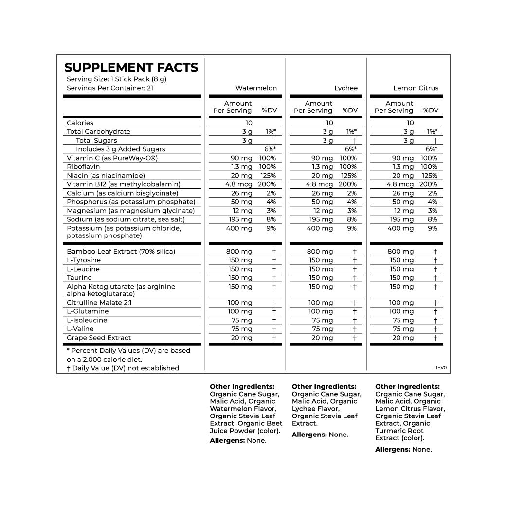 Key Ingredients: Vitamin C (as PureWay-C), Riboflavin, Niacin (as niacinamide), Vitamin B12 (as Methylcobalamin), Calcium (as calcium bisglycinate), Phosphorus (as potassium phosphate), Magnesium (as magnesium glycinate), Sodium (as sodium citrate, sea salt), Potassium (as potassium chloride, potassium phosphate), Bamboo Leaf Extract, L-Tyrosine, L-Leucine, Taurine, Alpha Ketoglutarate, L-Glutamine, L-Isoleucine, L-Valine, Grape Seed Extract